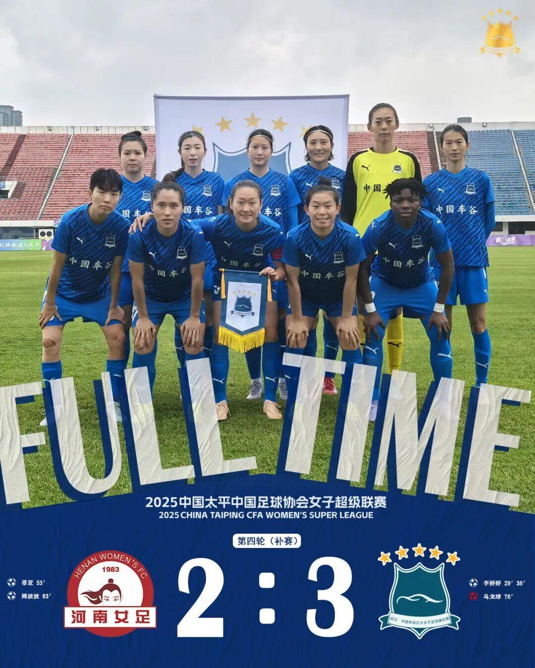 9月11日,2025赛季女超联赛第四轮(补赛),武汉车谷江大女足做客新乡市体育中心体育场,3比2战胜河南万仙山女足,升至积分榜第二,重燃争冠希望。